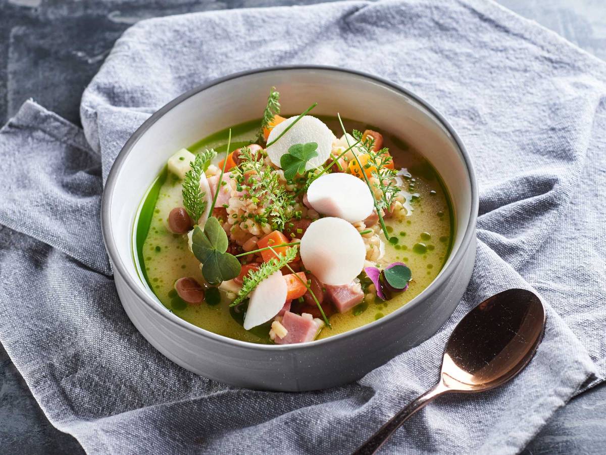 卢布尔雅那郊外的什马尔纳山(Smarna Gora),是首都热门的一日游目的地。山顶的传统餐厅供应一道当地特色招牌菜——Šmarnogorski ričet。它以大麦为主料,加入新鲜蔬菜和烟熏猪肉,慢火炖煮而成,口感浓郁醇厚。实际上,ričet(大麦炖菜)或ječmen(大麦料理)是斯洛文尼亚最普及、最具代表性的传统菜肴之一。
