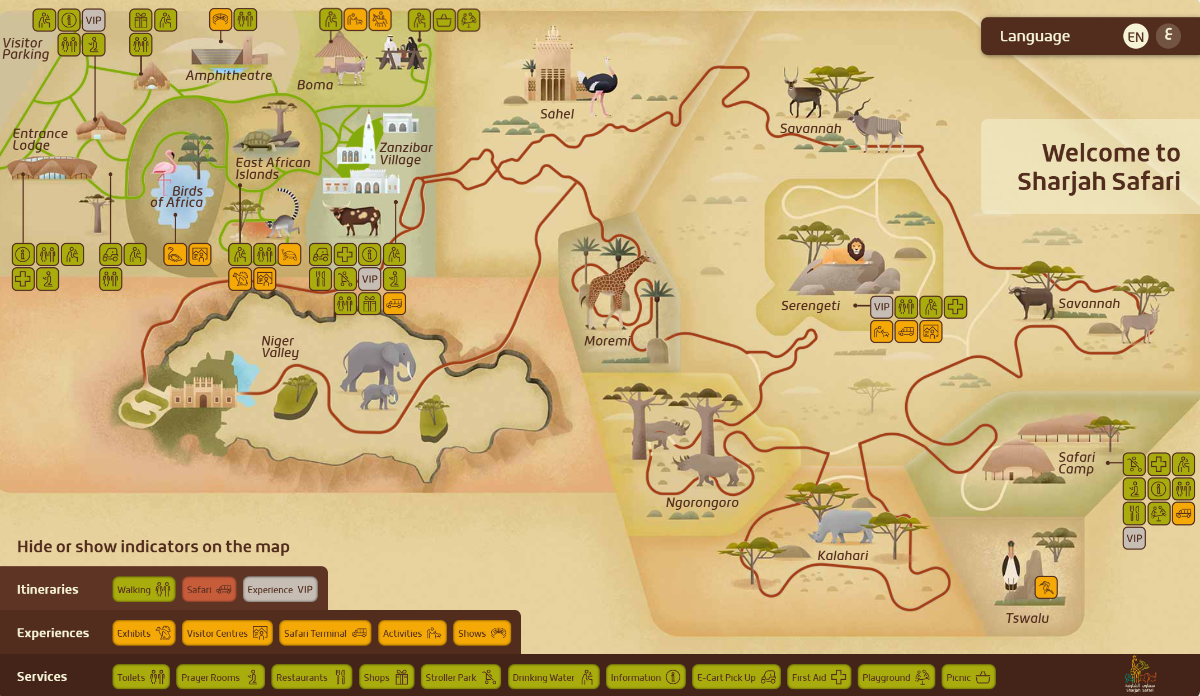 搭乘配备语音导览的越野车或空调大巴,穿越“尼日尔谷地”(Niger Valley)、撒哈拉沙漠与苏丹草原间的“萨赫勒”(Sahel)地带、“莫瑞米”(Moremi)保护区、“萨凡纳”(Savannah)稀树草原、非洲伊甸园“恩戈罗恩戈罗”(Ngorongoro)死火山口、“喀拉哈里”(Kalahari)沙漠、“茨瓦卢”(Tswalu)保护区等多个主题园区,沉浸式感受野性自然的脉动。