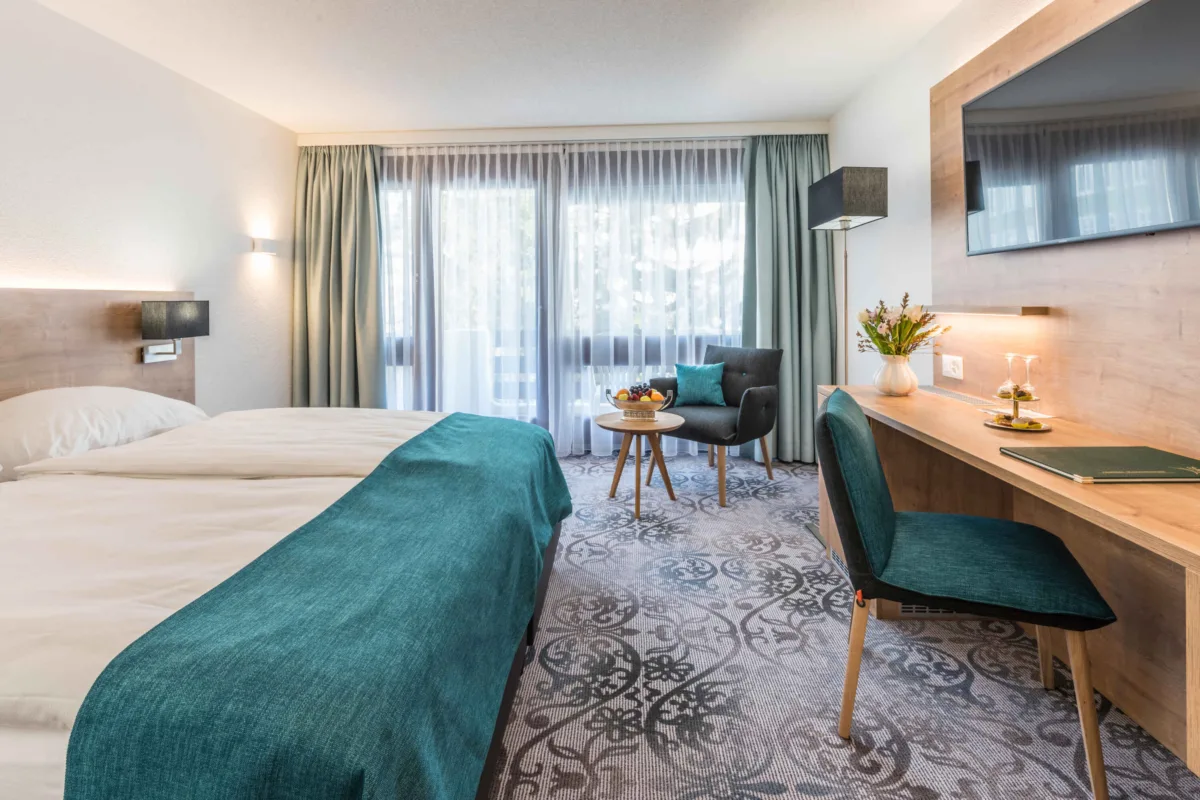 酒店拥有97间客房,风格典雅,融合阿尔卑斯风情与现代设施。标准双人间以瑞士松木家具营造温馨氛围,配备沙发床,适合家庭入住,最多可容纳6人。
