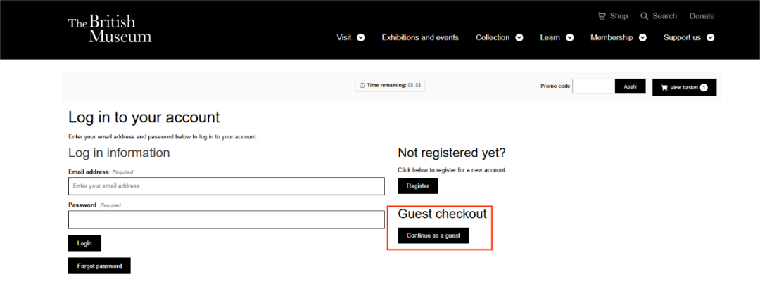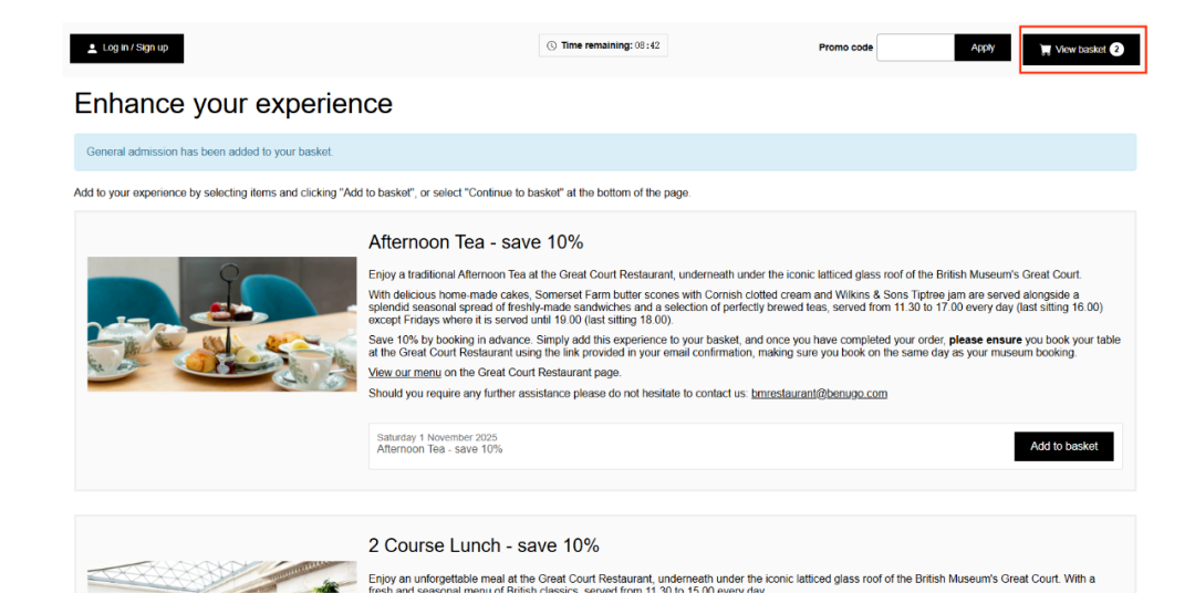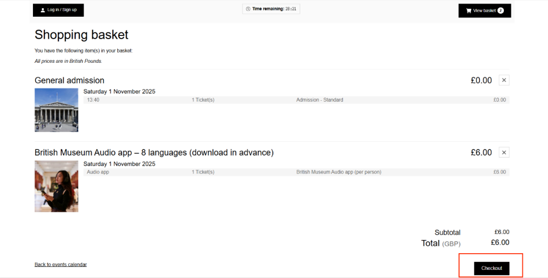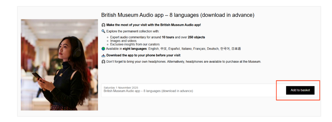 4.页面底部可加购选择“British Museum Audio App”大英博物馆官方导览App套餐,涵盖馆内重点藏品和多条经典参观路线,加购完成点击右上角的“View basket”。