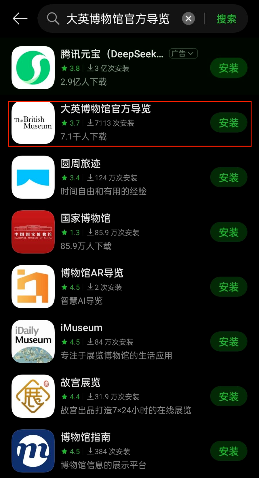 1.在手机应用商店搜索“大英博物馆官方导览”并点击安装。