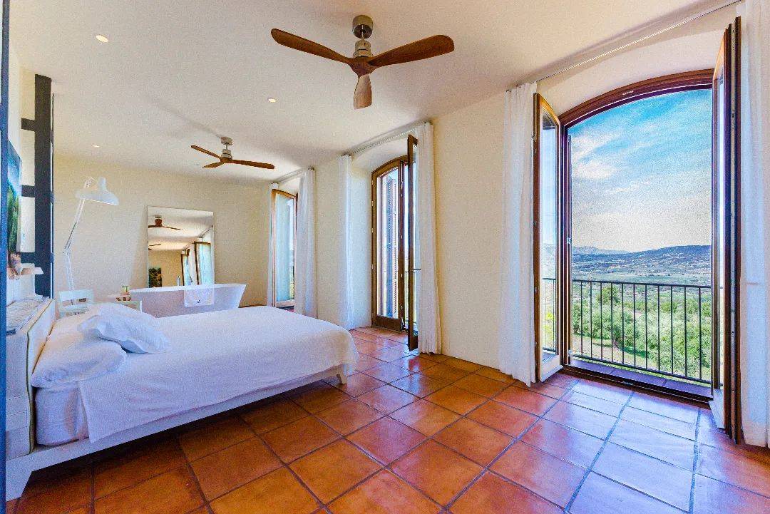 客房设计简约而舒适,站在窗前便可眺望远方景色。最令人心动的是那座与橄榄园相邻的泳池,池水清澈见底,游至池畔,整片橄榄园与远处山脉的景色尽收眼底,仿佛置身于一幅生动的自然画卷中。